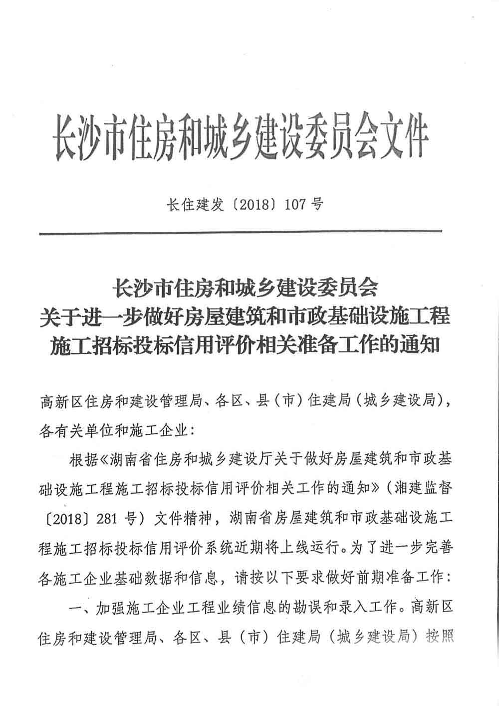 關(guān)于進一步做好房屋建筑和市政基礎(chǔ)設(shè)施工程施工招投標(biāo)信用評價相關(guān)準備工作的通知(長住建發(fā)(2018)107號)